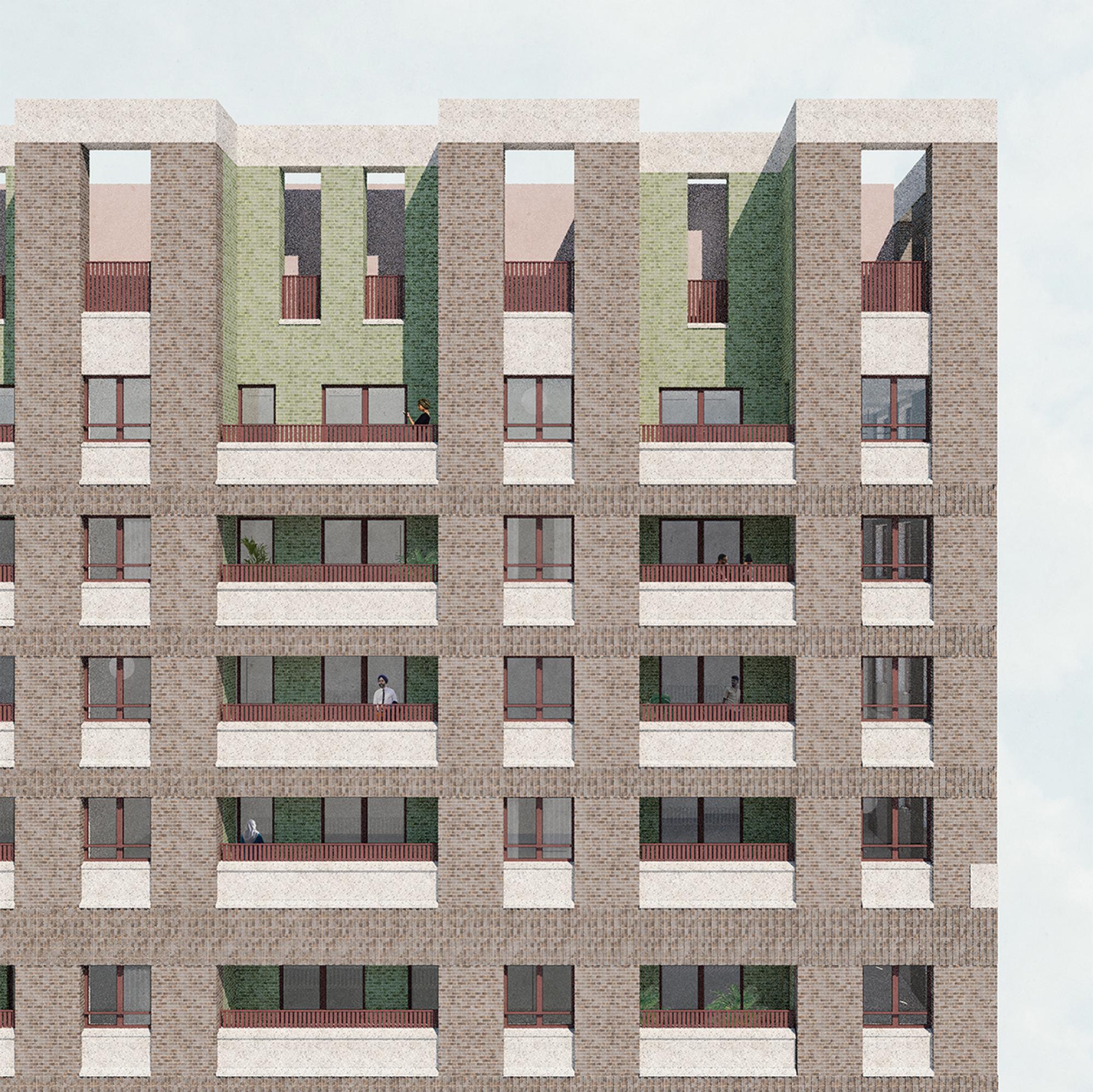 In materials palette and detail, the buildings are expressed as a family, each with a subtly different brick colour and type. We used complementary glazed bricks to line inset balconies, drawing on the history of Martinware Pottery production in Southall, and locating a finer quality material where people are in close proximity and will have most impact.